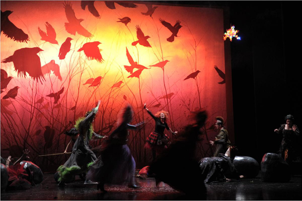 Ina Annett Keppel hat den Kinderbuchklassiker auf ein paar zentrale Szenen und Figuren reduziert und unaufdringlich modernisiert. Ihre kleine Hexe hat wilde rote Haare wie der Pumuckl, der Rabe Abraxas kommt ganz in Schwarz daher wie ein Punk. Auf grellbunte Knalleffekte hat man in Darmstadt verzichtet, Gesine Kuhns Bühnenbauten und Kostüme setzen mit sparsamen Andeutungen und gemalten Prospekten eher auf die Kraft der Imagination als auf Überwältigung durch Bilderfluten. Auch retten die originell eingebauten Songs vor Durchhängern. Da wird einmal ein Stück vom Rhythmus zweier Blechbüchsen begleitet, und die Holzweiber tanzen und stampfen mit ihren Rollatoren einen schönen Groove. Das ist mit wenig Aufwand pfiffig und wirkungsvoll.Berufsverbot auf dem Blocksberg, Stefan Benz, Darmstädter Echo,19.11.2013: